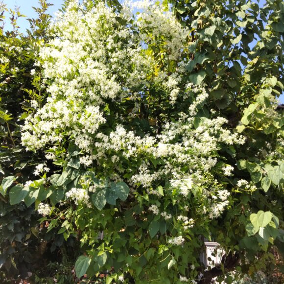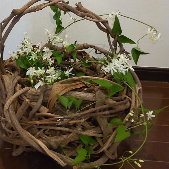 そして庭の仙人草。この暑さでも、猛烈に成長しキレイな花を咲かせてくれました。くずのカゴに活けたらほんのり甘い香りが。花も繊細でキレイです